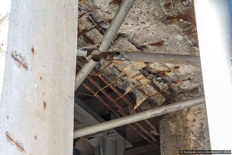 Оказывается, на самом деле, путепровод находится в плохом техническом состоянии. На тротуарной части видны трещины, а снизу многотонную конструкцию подпирают металлические "костыли". В конструкциях путепровода видны огромные разрывы в бетоне, а также места с отколотыми частями бетонных конструкций. В некоторых местах забиты деревянные колья (видимо, это "маяки" для того, чтобы видеть, что происходит с путепроводом), которые уже расползаются под весом бетона, а это означает, что мост потихоньку разрушается.